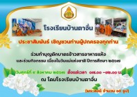 โรงเรียนบ้านตาจั่น ขอเชิญพุทธศาสนิกชนร่วมถวายภัตราหารเช้า ตักบาตรข้าวสารอาหารแห้ง พระสงฆ์ 19 รูป เนื่องในวันวิสาขบูชา ในวันที่ 21 พ.ค. 2567