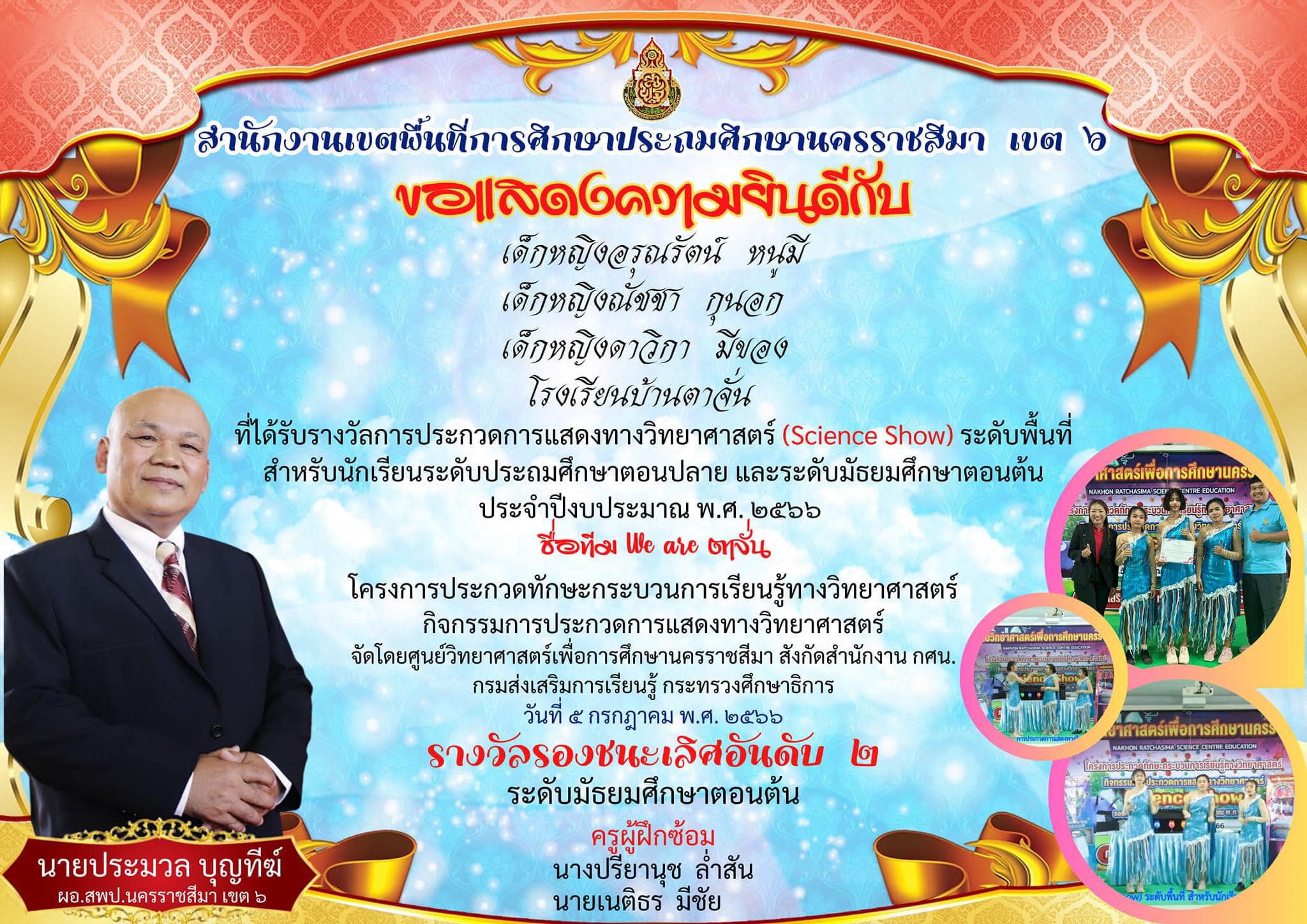 โรงเรียนบ้านตาจั่น นำโดยครูกลุ่มสาระการเรียนรู้วิทยาศาสตร์และเทคโนโลยี นำนักเรียนเข้าร่วมกิจกรรมการเเข่งขันการแสดงทางวิทยาศาสตร์ Science Show ได้รับรางวัล รองชนะเลิศอันดับ 2 |