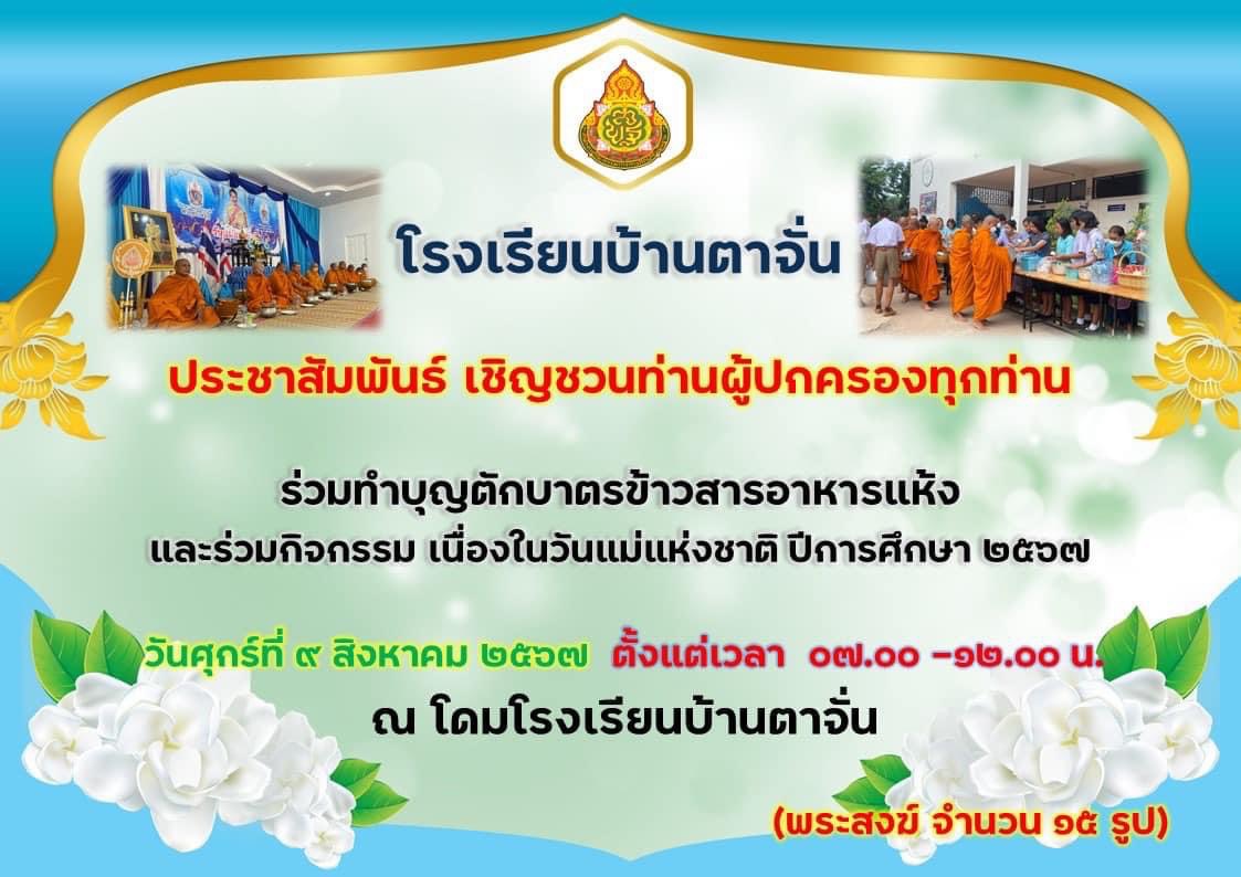 เชิญชวนท่านผู้ปกครองทุกท่านร่วมทำบุญตักบาตรข้าวสารอาหารแห้งและร่วมกิจกรรมเนื่องในวันแม่แห่งชาติในวันศุกร์ที่ 9 สิงหาคม 2567