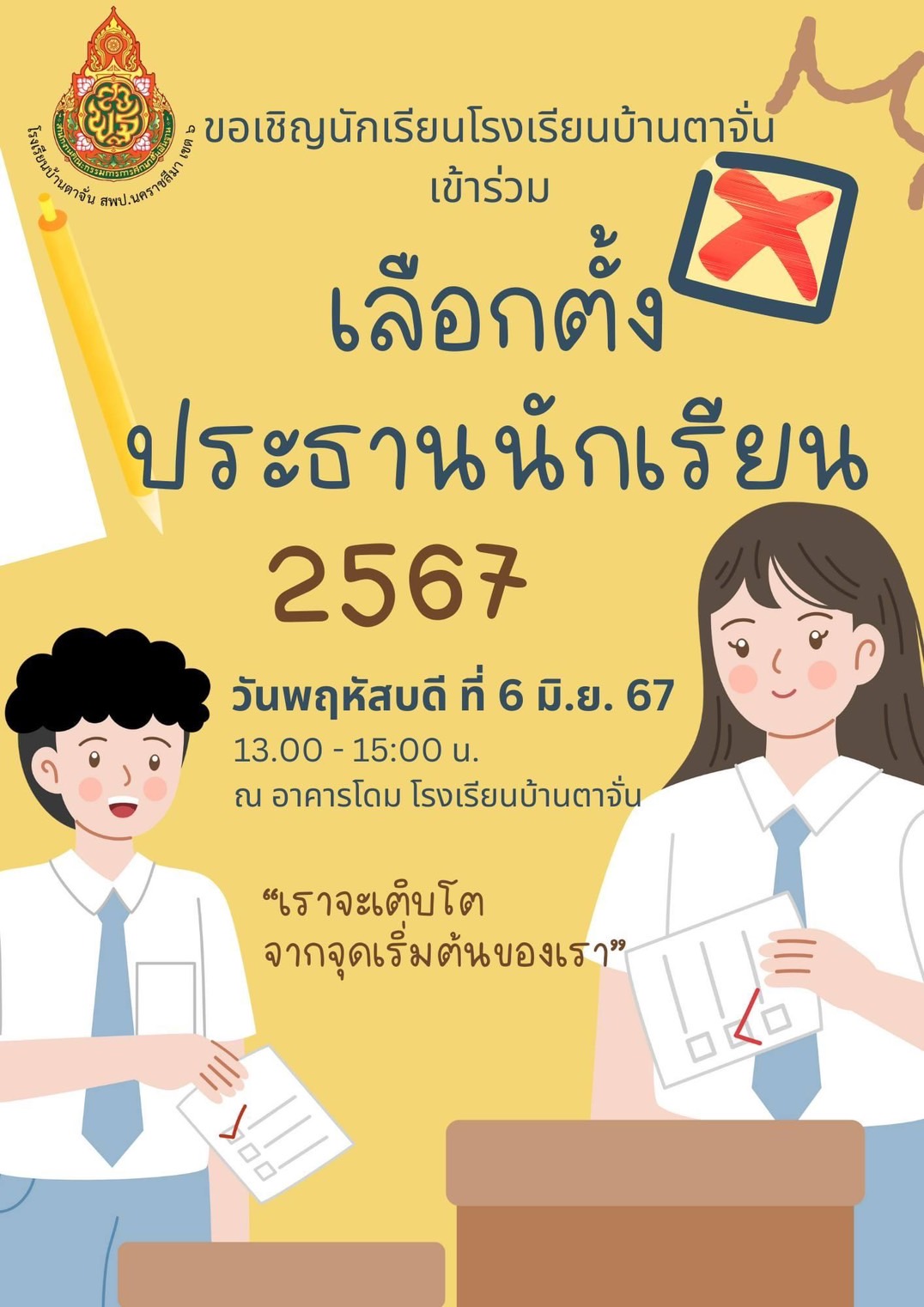 เชิญชวนนักเรียนโรงเรียนบ้านตาจั่นทุกคน ไปใช้สิทธิ์เลือกตั้งประธานนักเรียน ประจำปีการศึกษา 2567
