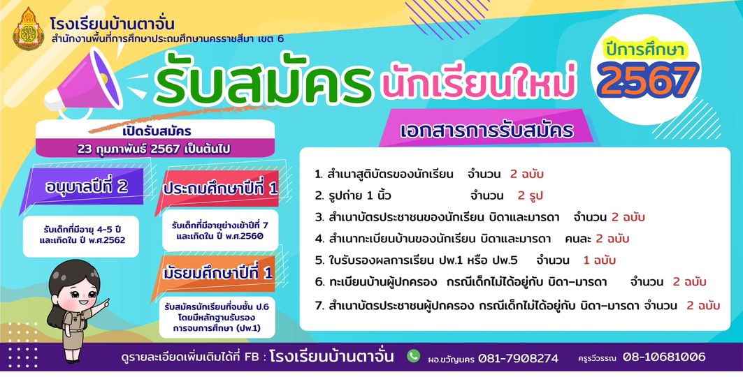 โรงเรียนบ้านตาจั่น รับสมัครนักเรียนใหม่ประจำปีการศึกษา 2567